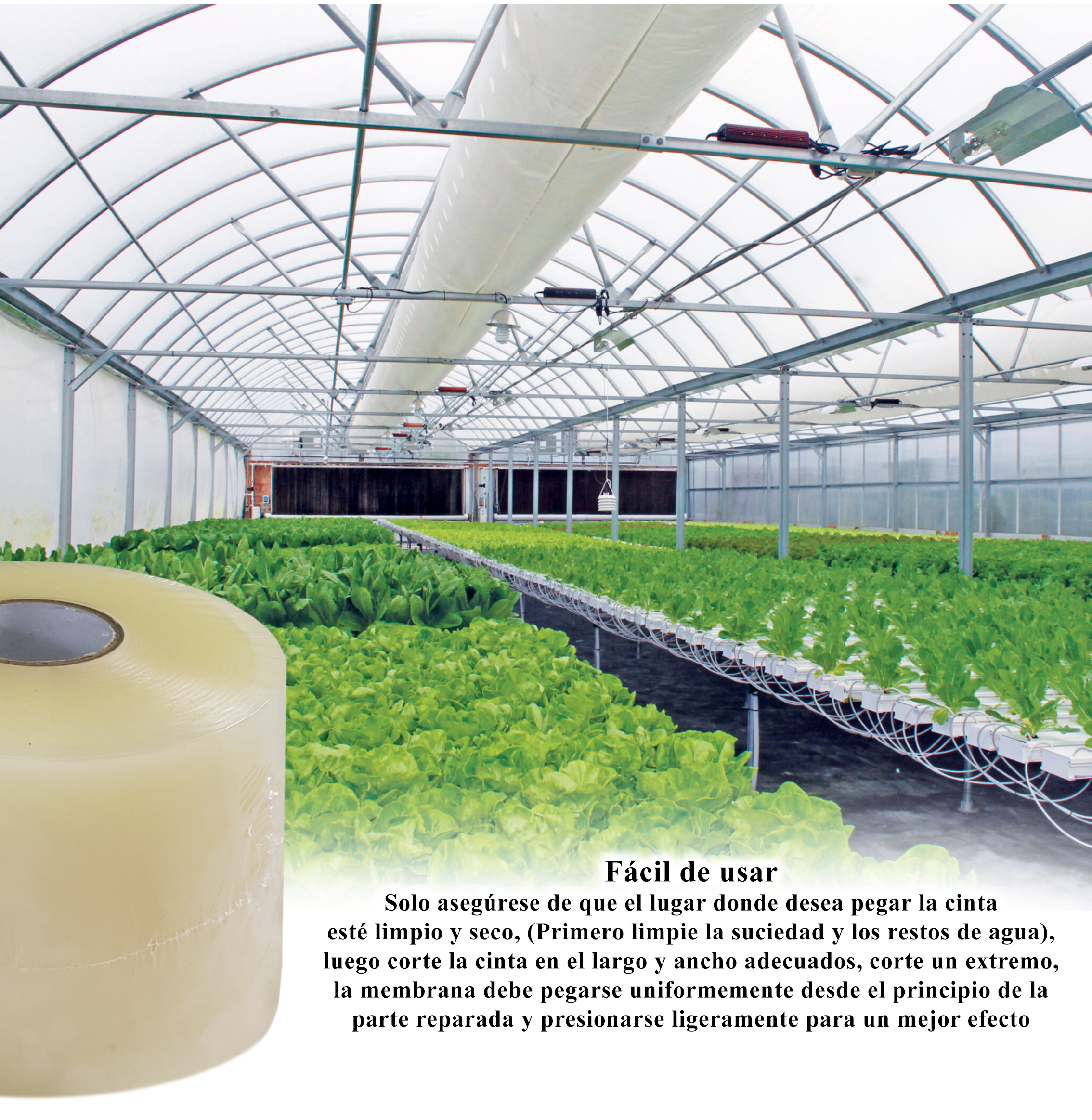 Permite hacer una reparación total, por ser una cinta de polietileno de alta resistencia y duración que posee un adhesivo especial para pegar o parchar película de polietileno, lo cual proporciona la misma resistencia a la exposición solar, agua, tierra, etc. Previniendo que el plástico se rompa más y el costo sea mayor, manteniendo todos los beneficios.