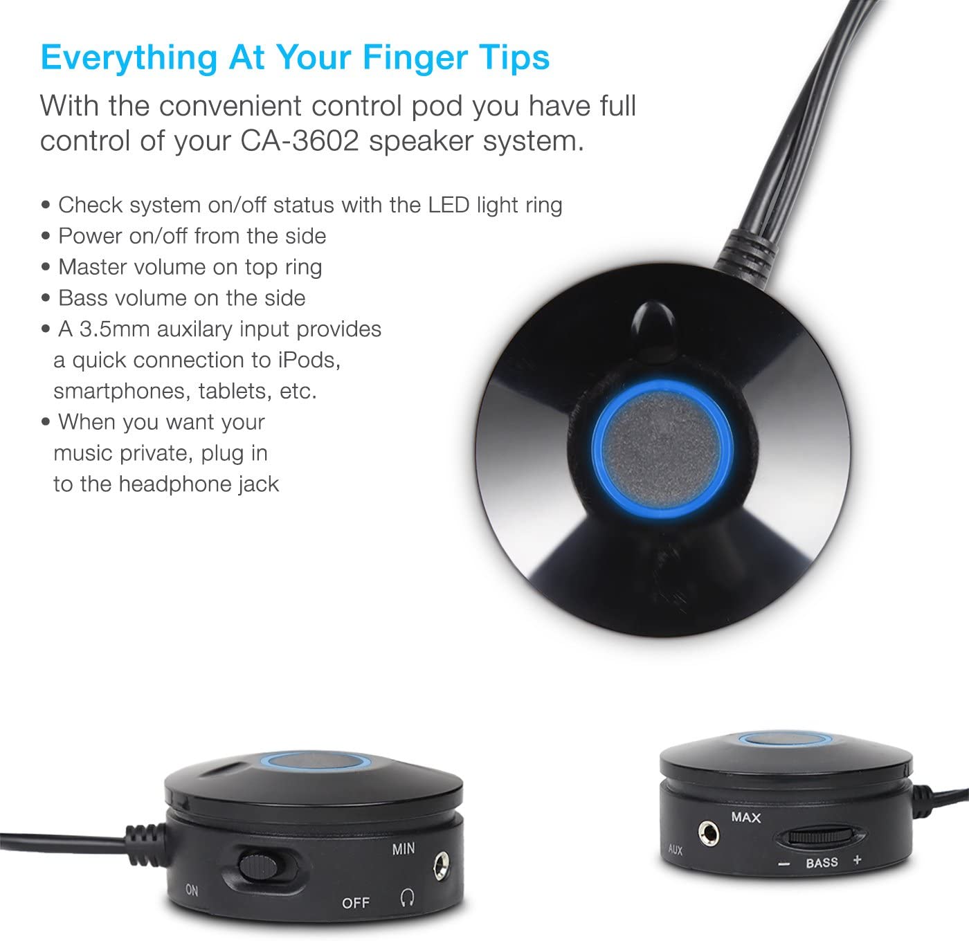 – FÁCIL DE USAR: El cómodo módulo de control le brinda control total sobre su sistema de sonido. Ajuste el volumen, enciéndalo y apague, o use la toma de auriculares para esos momentos de escucha privada. Con fácil acceso a la entrada auxiliar de 3,5 mm, puede conectar rápidamente su teléfono celular, tableta, reproductor de MP3 o sistema de juego para mejorar el sonido. Además, el control de volumen de tumbas permite la armonía del sonido tal como te gusta.