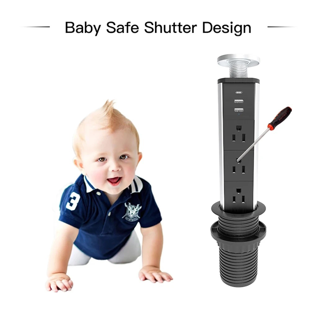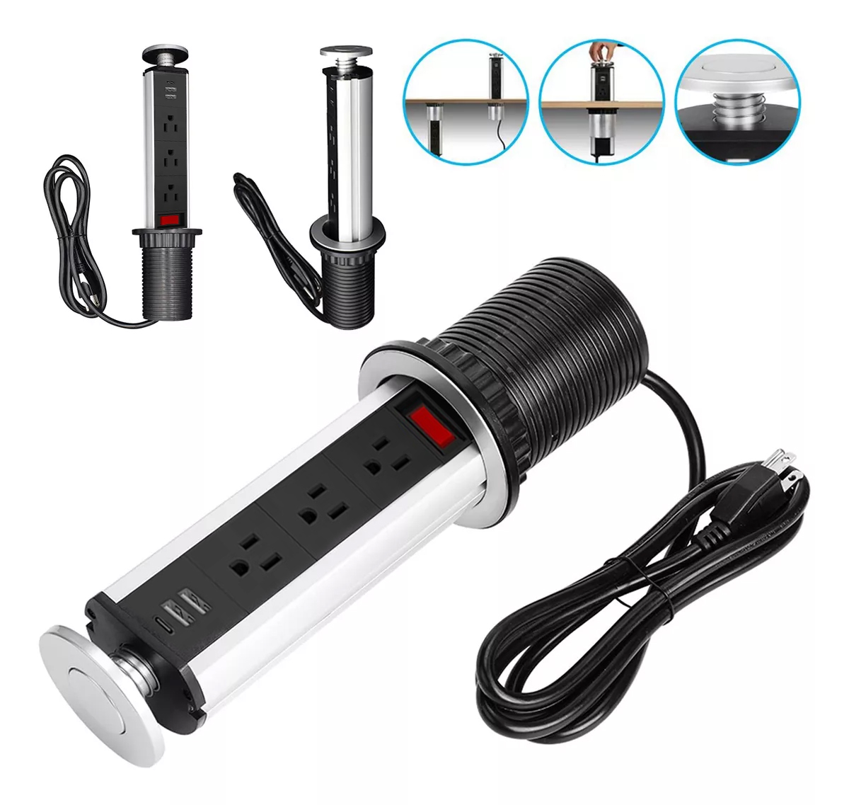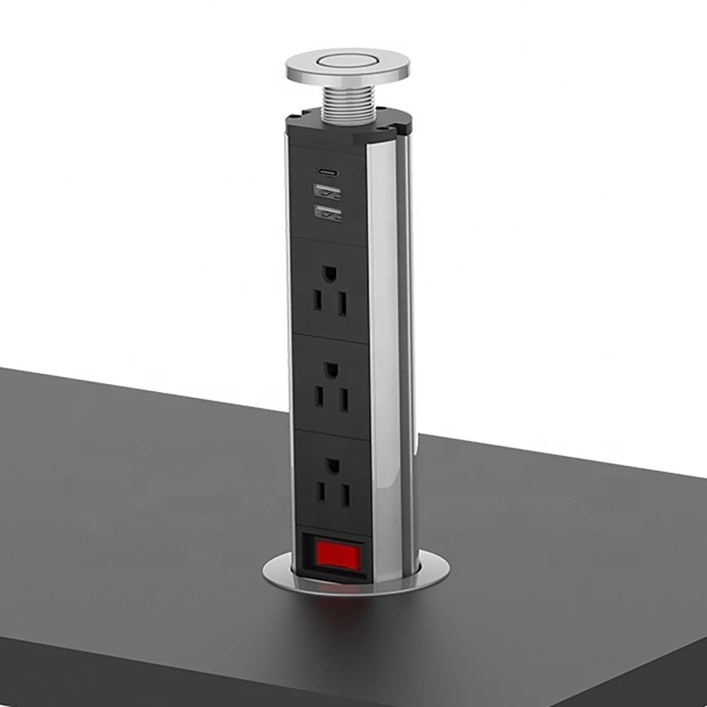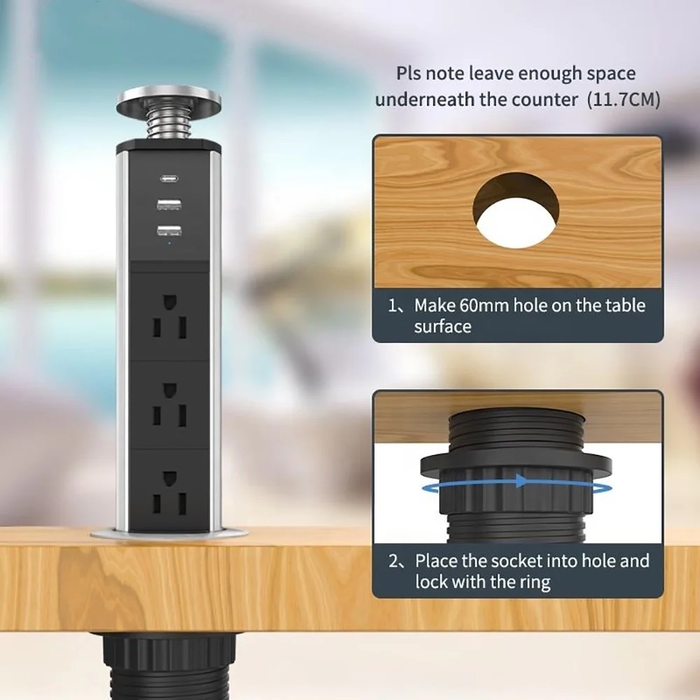 Cuando necesites esta regleta empotrada, puedes presionar el botón central y sacar la parte oculta de debajo de la mesa o del mostrador de la cocina; cuando no la necesites, simplemente presiona la unidad y presiona más el botón central. Haz que quede al ras de la mesa. o superficie de trabajo.