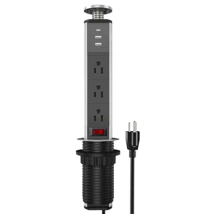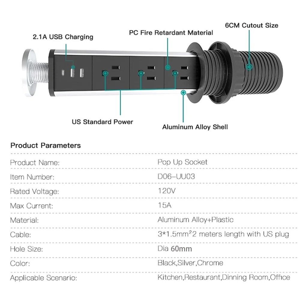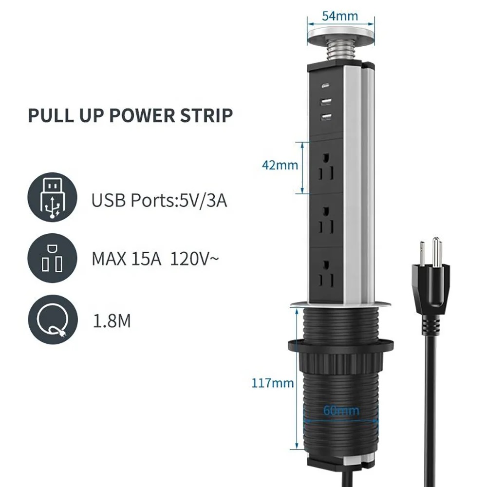 Toma de corriente retráctil empotrada oculta para escritorio con 3 tomas y 2 puertos USB, toma de corriente multifuncional plateada de 60 mm para dispositivos electrónicos y USB de la oficina de la cocina del hogar.