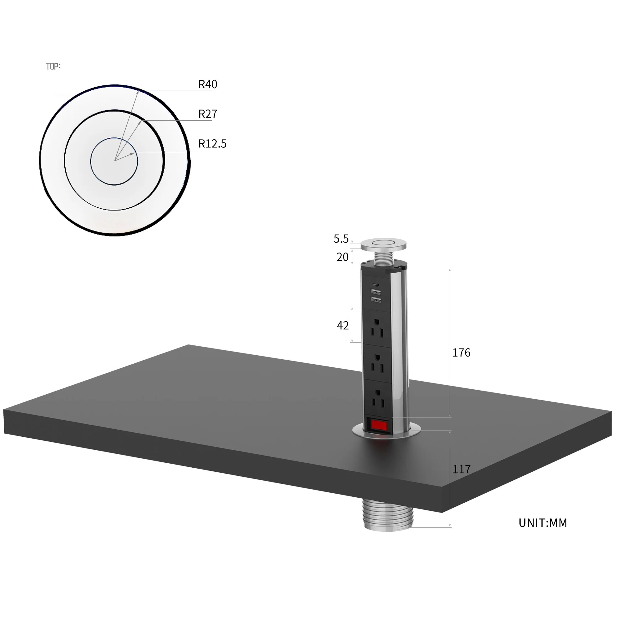 (3) Multifuncional: esta toma de corriente emergente puede equiparse con toma de corriente, datos y conectores USB. La configuración se puede adaptar a sus necesidades.