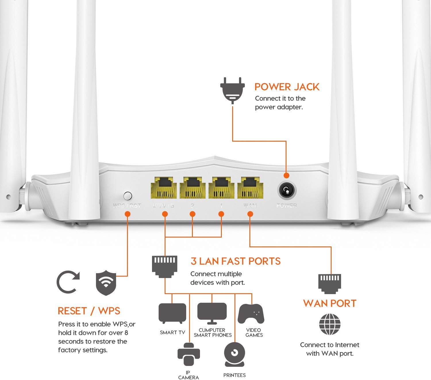 - Presentado con antenas de alta ganancia de 4 * 6dBi y equipado con una CPU de alto rendimiento de 28 nm, brinda una mejor experiencia en Internet.
