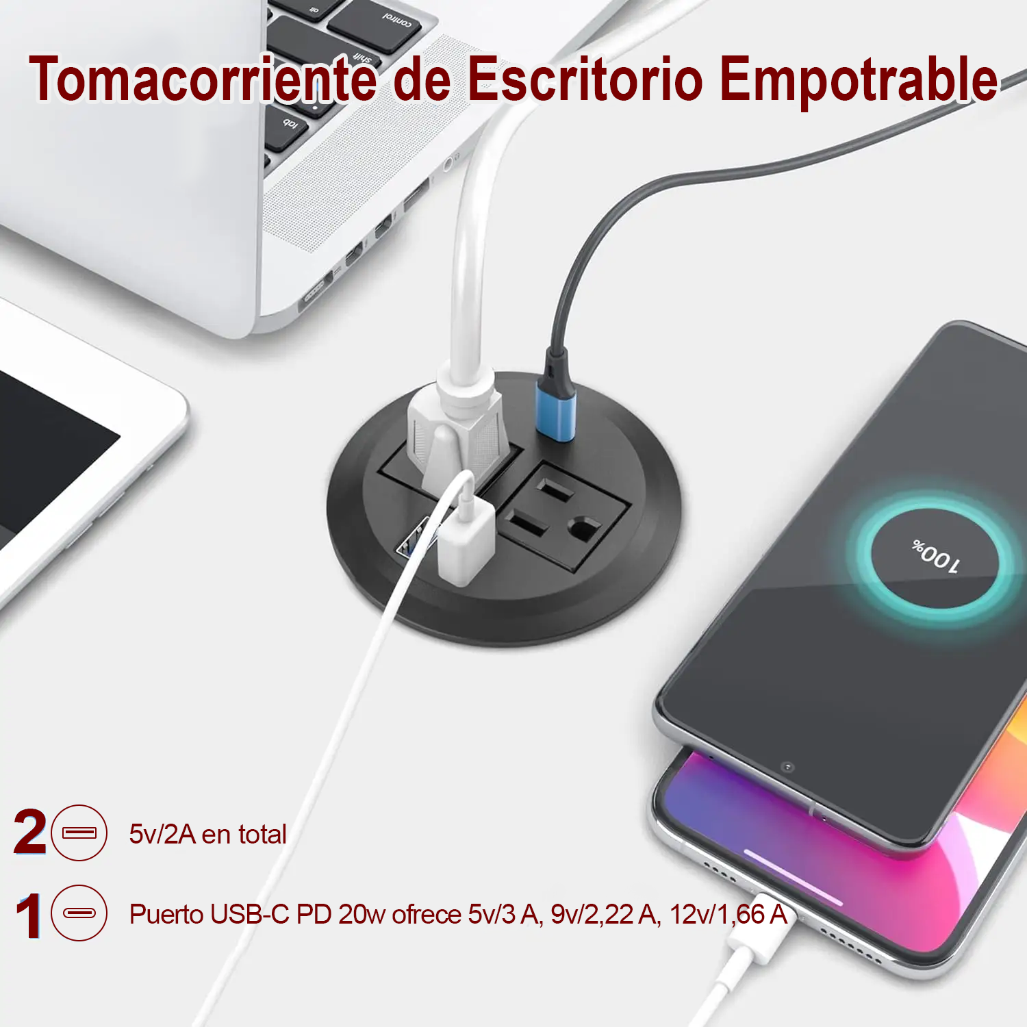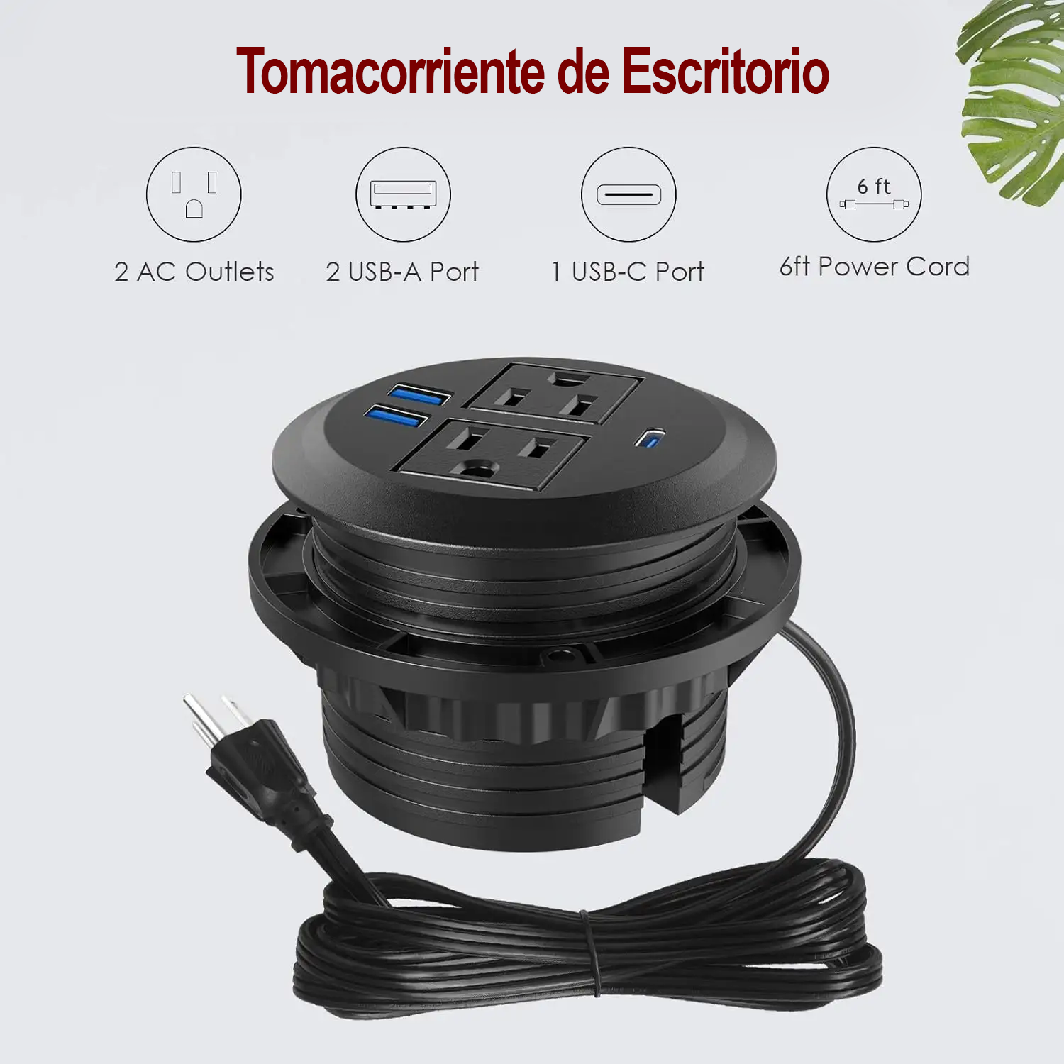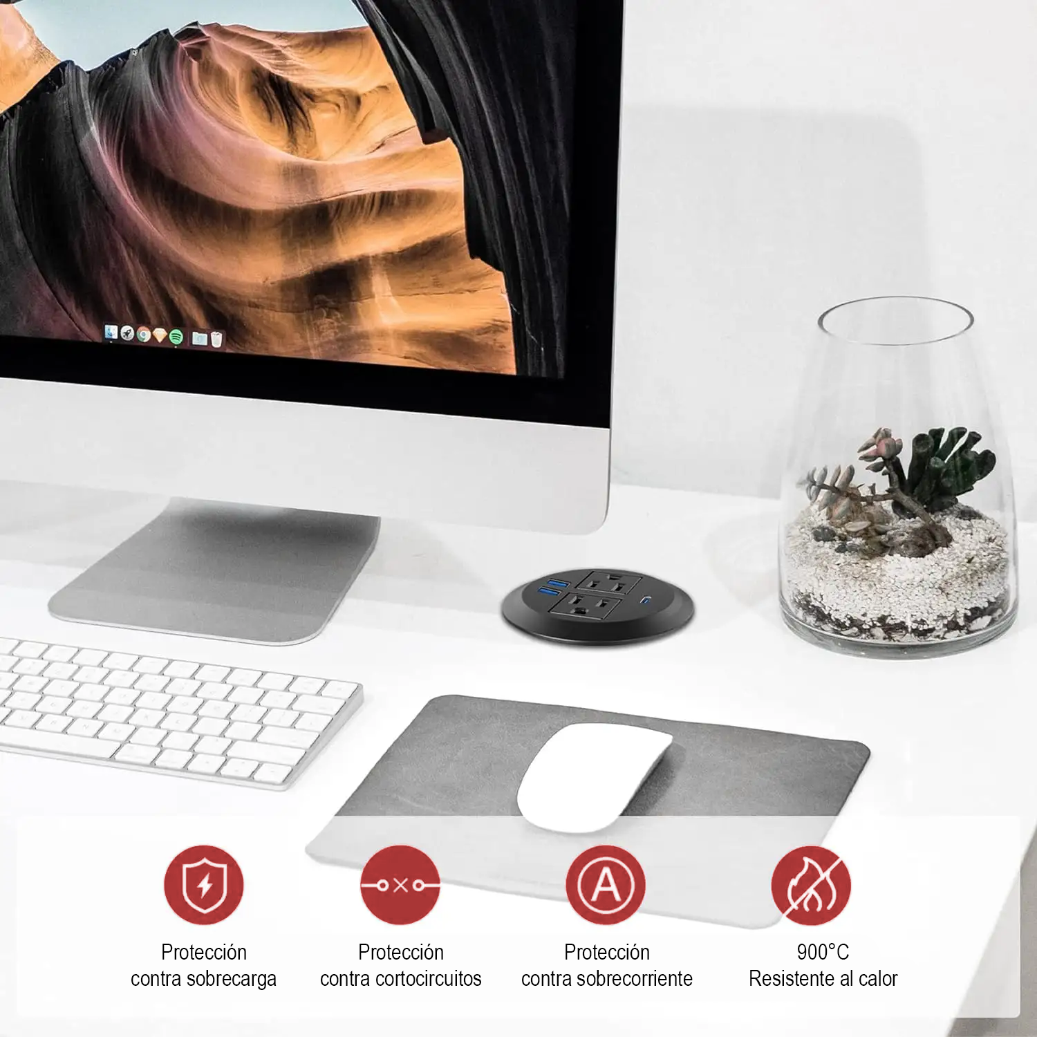 [TOMACORRIENTE DE ESCRITORIO 20W] 2 puerto tomacorrientes, 2 puertos carga USB 3 y 1 puerto carga Tipo C integrado en la parte superior.